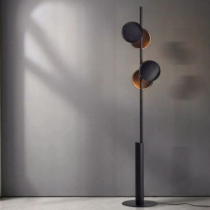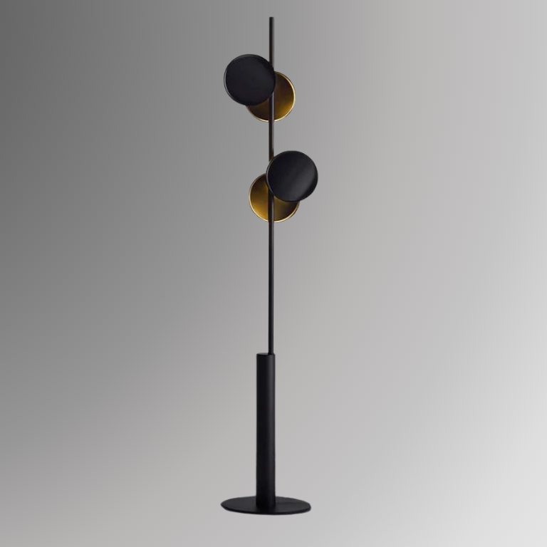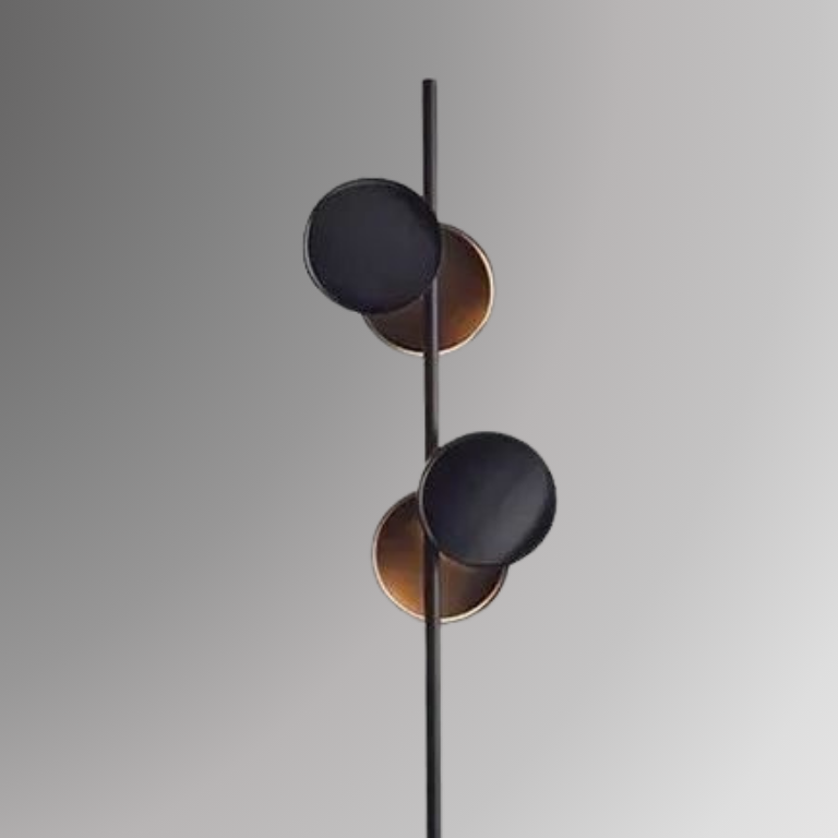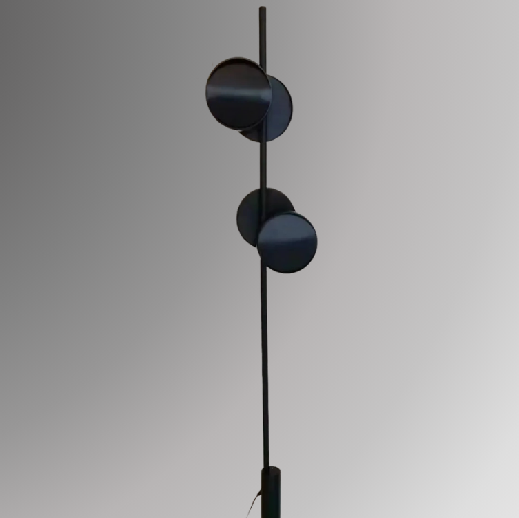 Standing 63 inches tall, Obscura is composed of smooth black iron, its four light sources partially veiled by sculptural discs. The effect is deliberate — a balance of light and shadow, presence and pause.