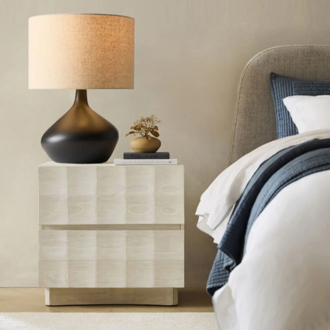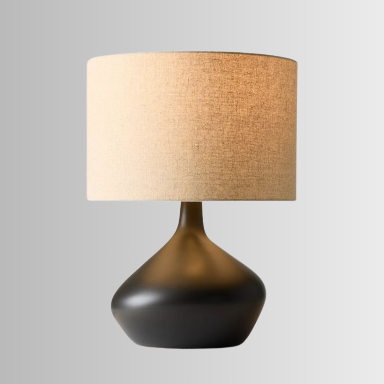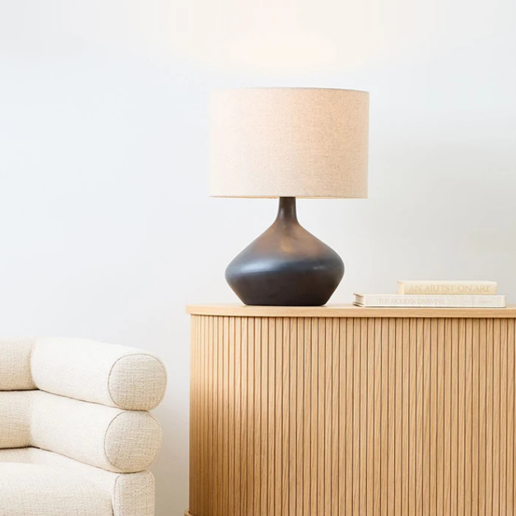 The body flows with the natural rhythm of a gourd, sculpted in smooth black resin and balanced by a cylindrical linen shade. At 15.75" in height, it carries a quiet sculptural presence — grounded, contemporary, and softly luminous.